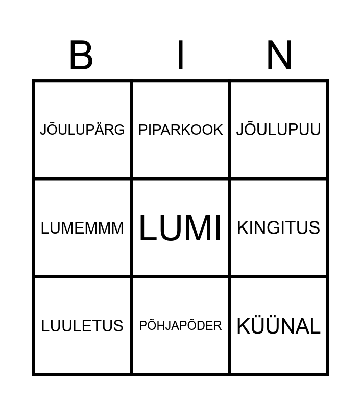 This bingo card has a free space and 11 words: PÄKAPIKK, PÕHJAPÕDER, KÜÜNAL, LUULETUS, PIPARKOOK, JÕULUPUU, KINGITUS, JÕULUVANA, LUMEMMM, JÕULUPÄRG and DETSEMBER.
