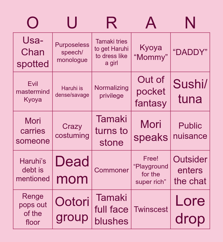 This bingo card has 25 words: Dead mom, Tamaki full face blushes, Normalizing privilege, Renge pops out of the floor, “DADDY”, Usa-Chan spotted, Evil mastermind Kyoya, Purposeless speech/ monologue, Mori speaks, Commoner, Out of pocket fantasy, Mori carries someone, Free! “Playground for the super rich”, Outsider enters the chat, Haruhi is dense/savage, Lore drop, Public nuisance, Tamaki tries to get Haruhi to dress like a girl, Sushi/ tuna, Crazy costuming, Tamaki turns to stone, Ootori group, Haruhi’s debt is mentioned, Kyoya “Mommy” and Twinscest.