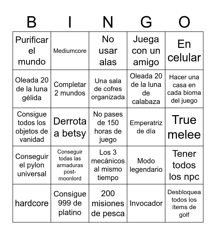 This bingo card has 25 words: Conseguir todas las armaduras post-moonlord, 200 misiones de pesca, Una sala de cofres organizada, hardcore, En celular, Purificar el mundo, Oleada 20 de la luna gélida, Mediumcore, Emperatriz de día, Los 3 mecánicos al mismo tiempo, Oleada 20 de la luna de calabaza, Consigue todos los objetos de vanidad, Modo legendario, Tener todos los npc, Completar 2 mundos, Desbloquea todos los ítems de golf, True melee, No usar alas, Hacer una casa en cada bioma del juego, Derrota a betsy, No pases de 150 horas de juego, Consigue 999 de platino, Conseguir el pylon universal, Juega con un amigo and Invocador.