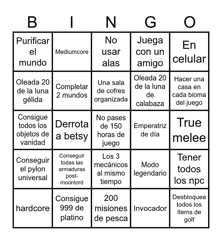 This bingo card has 25 words: Conseguir todas las armaduras post-moonlord, 200 misiones de pesca, Una sala de cofres organizada, hardcore, En celular, Purificar el mundo, Oleada 20 de la luna gélida, Mediumcore, Emperatriz de día, Los 3 mecánicos al mismo tiempo, Oleada 20 de la luna de calabaza, Consigue todos los objetos de vanidad, Modo legendario, Tener todos los npc, Completar 2 mundos, Desbloquea todos los ítems de golf, True melee, No usar alas, Hacer una casa en cada bioma del juego, Derrota a betsy, No pases de 150 horas de juego, Consigue 999 de platino, Conseguir el pylon universal, Juega con un amigo and Invocador.