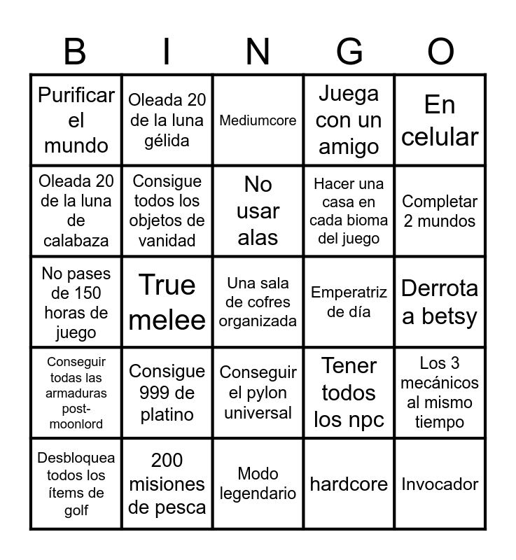 This bingo card has 25 words: Conseguir todas las armaduras post-moonlord, 200 misiones de pesca, Una sala de cofres organizada, hardcore, En celular, Purificar el mundo, Oleada 20 de la luna gélida, Mediumcore, Emperatriz de día, Los 3 mecánicos al mismo tiempo, Oleada 20 de la luna de calabaza, Consigue todos los objetos de vanidad, Modo legendario, Tener todos los npc, Completar 2 mundos, Desbloquea todos los ítems de golf, True melee, No usar alas, Hacer una casa en cada bioma del juego, Derrota a betsy, No pases de 150 horas de juego, Consigue 999 de platino, Conseguir el pylon universal, Juega con un amigo and Invocador.