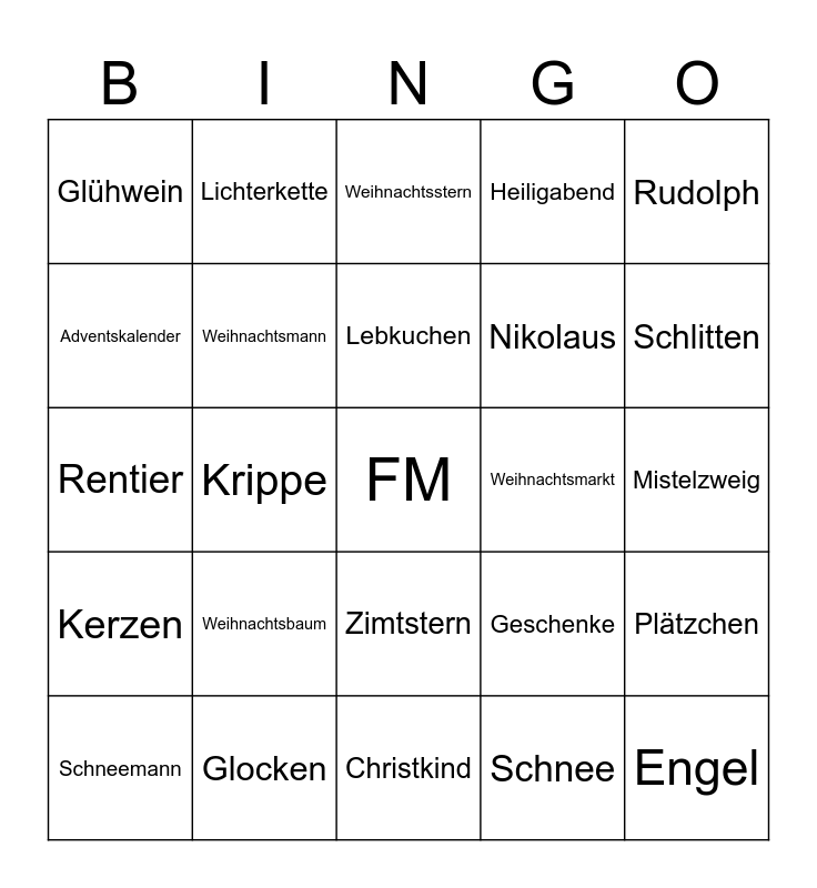 This bingo card has a free space and 25 words: Weihnachtsbaum, Christkind, Lebkuchen, Schneemann, Rudolph, Glühwein, Adventskalender, Lichterkette, Weihnachtsmarkt, Zimtstern, Nikolaus, Rentier, Geschenke, Plätzchen, Weihnachtsmann, Tannenbaum, Mistelzweig, Weihnachtsstern, Schlitten, Krippe, Engel, Glocken, Kerzen, Heiligabend and Schnee.