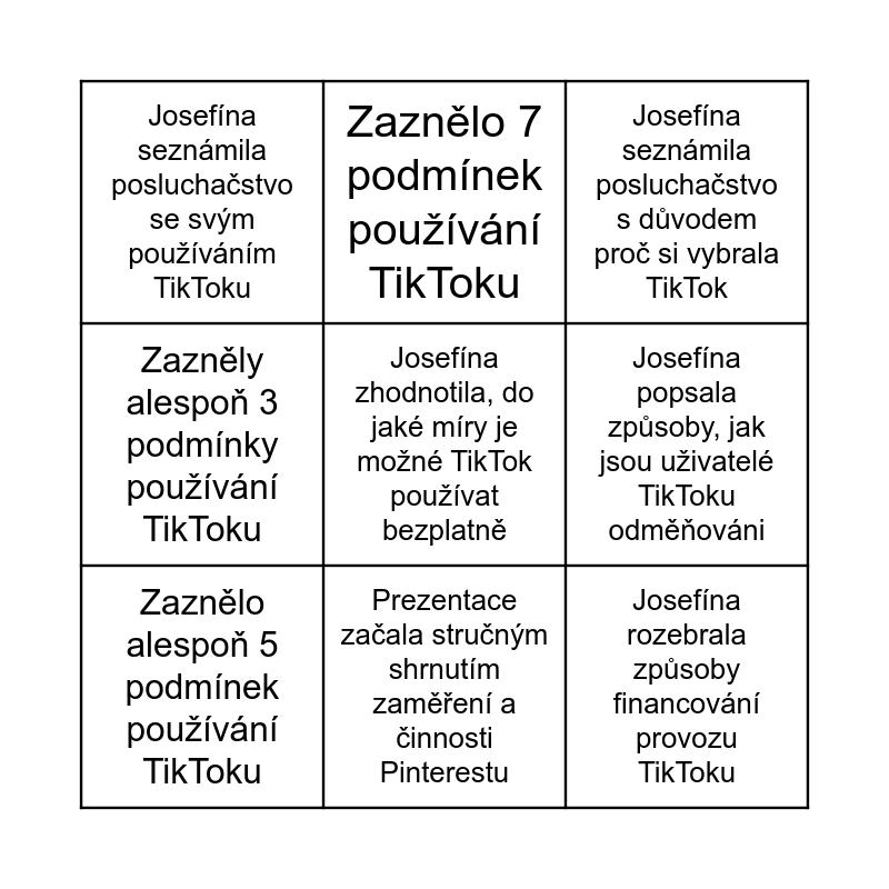 This bingo card has 10 words: Prezentace začala stručným shrnutím zaměření a činnosti Pinterestu, Josefína seznámila posluchačstvo s důvodem proč si vybrala TikTok, Josefína seznámila posluchačstvo se svým používáním TikToku, Josefína zhodnotila, do jaké míry je možné TikTok používat bezplatně, Zazněly alespoň 3 podmínky používání TikToku, Zaznělo alespoň 5 podmínek používání TikToku, Zaznělo 7 podmínek používání TikToku, Josefína zjistila, jestli jsou populární uživatelé TikToku odměňováni, Josefína popsala způsoby, jak jsou uživatelé TikToku odměňováni and Josefína rozebrala způsoby financování provozu TikToku.