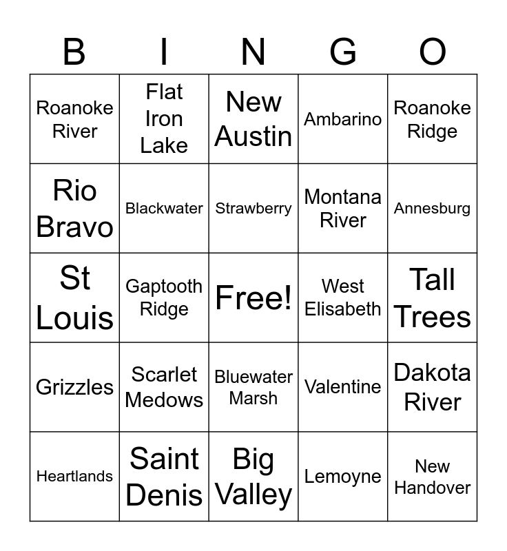 This bingo card has a free space and 24 words: Scarlet Medows, Saint Denis, Strawberry, Heartlands, Roanoke Ridge, Roanoke River, Rio Bravo, Flat Iron Lake, West Elisabeth, Bluewater Marsh, Montana River, St Louis, Valentine, Dakota River, Blackwater, Lemoyne, Tall Trees, New Austin, Annesburg, Gaptooth Ridge, New Handover, Grizzles, Ambarino and Big Valley.