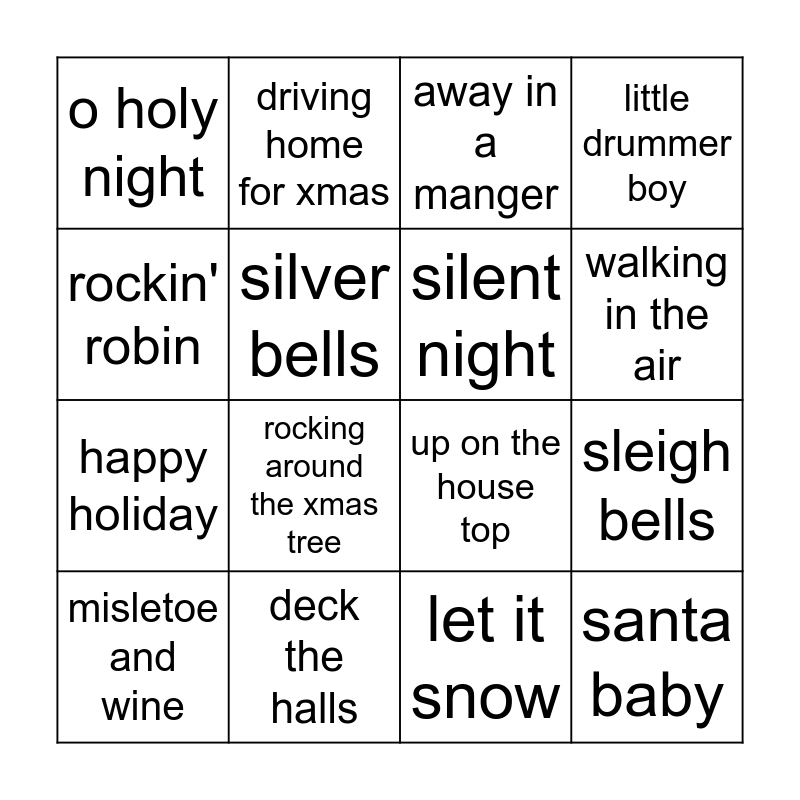 This bingo card has 32 words: wonderful xmas time, frosty the snowman, sleigh bells, marsh mallow world, santa baby, silent night, rockin' robin, winter wonderland, driving home for xmas, we 3 kings, walking in the air, away in a manger, run run rudolph, blue xmas, deck the halls, pretty paper, mary's boy child, up on the house top, jingle bell rock, holly jolly xmas, joy to the world, white xmas, let it snow, santa claus is coming to town, misletoe and wine, little drummer boy, happy holiday, silver bells, o holy night, do you hear what i hear, when santa claus gets your letter and rocking around the xmas tree.