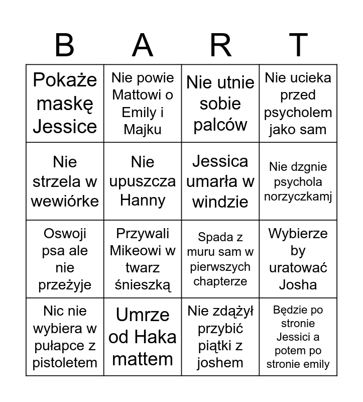 This bingo card has 16 words: Umrze od Haka mattem, Wybierze by uratować Josha, Nie utnie sobie palców, Pokaże maskę Jessice, Oswoji psa ale nie przeżyje, Nie powie Mattowi o Emily i Majku, Spada z muru sam w pierwszych chapterze, Nie zdążył przybić piątki z joshem, Nie strzela w wewiórke, Nie upuszcza Hanny, Nic nie wybiera w pułapce z pistoletem, Nie ucieka przed psycholem jako sam, Przywali Mikeowi w twarz śnieszką, Nie dzgnie psychola norzyczkamj, Jessica umarła w windzie and Będzie po stronie Jessici a potem po stronie emily.