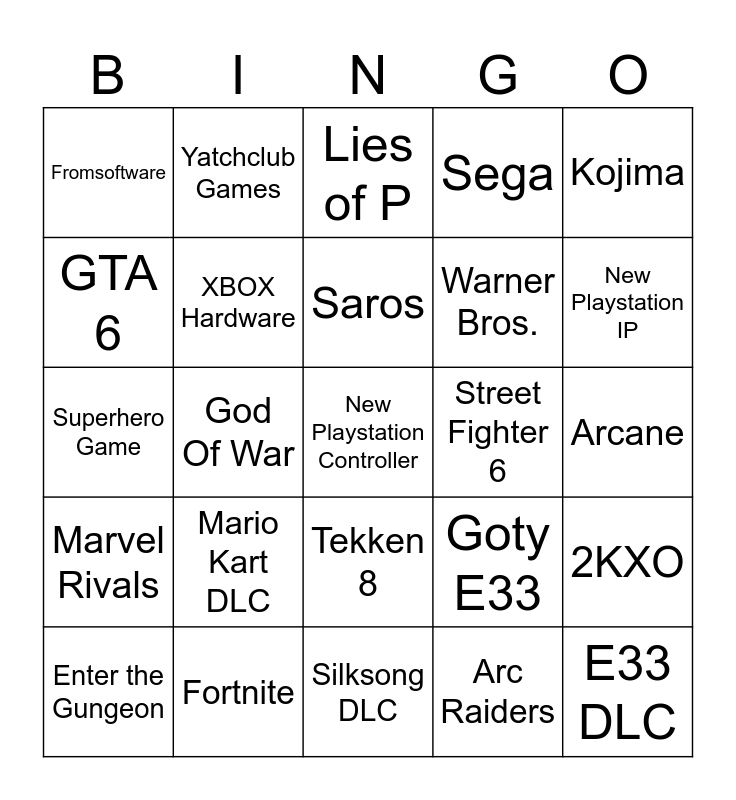This bingo card has 25 words: Mario Kart DLC, Silksong DLC, Saros, Enter the Gungeon, Kojima, Fromsoftware, GTA 6, Yatchclub Games, Street Fighter 6, Tekken 8, Warner Bros., Superhero Game, Goty E33, 2KXO, XBOX Hardware, E33 DLC, Arcane, Lies of P, New Playstation IP, God Of War, New Playstation Controller, Fortnite, Marvel Rivals, Sega and Arc Raiders.