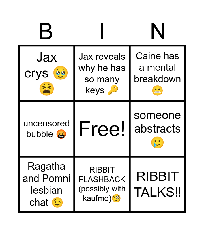 This bingo card has a free space and 8 words: someone abstracts 🥲, Caine has a mental breakdown 😬, Jax reveals why he has so many keys 🔑, Ragatha and Pomni lesbian chat 😉, Jax crys 🥹😫, RIBBIT TALKS‼, uncensored bubble 🤬 and RIBBIT FLASHBACK (possibly with kaufmo)🧐.