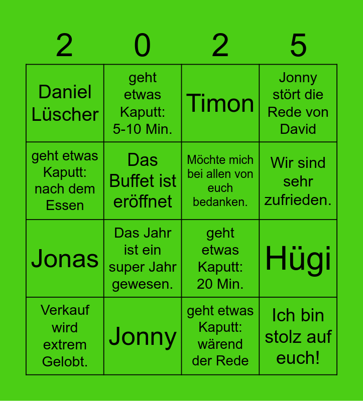 This bingo card has 16 words: Jonny, Hügi, Timon, Daniel Lüscher, Jonas, geht etwas Kaputt: 5-10 Min., geht etwas Kaputt: 20 Min., geht etwas Kaputt: wärend der Rede, geht etwas Kaputt: nach dem Essen, Das Buffet ist eröffnet, Verkauf wird extrem Gelobt., Jonny stört die Rede von David, Das Jahr ist ein super Jahr gewesen., Wir sind sehr zufrieden., Möchte mich bei allen von euch bedanken. and Ich bin stolz auf euch!.