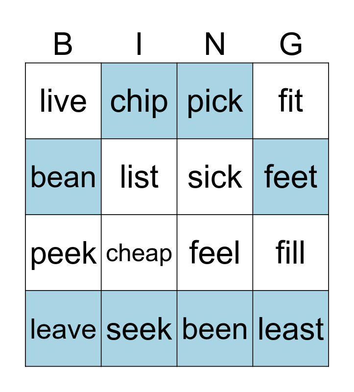 This bingo card has 16 words: seek, fill, pick, live, peek, chip, feel, been, bean, list, leave, fit, cheap, feet, sick and least.
