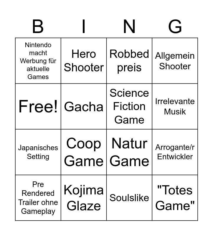 This bingo card has 16 words: Kojima Glaze, Arrogante/r Entwickler, Robbed preis, Nintendo macht Werbung für aktuelle Games, Japanisches Setting, Hero Shooter, Natur Game, Soulslike, Free!, Gacha, Pre Rendered Trailer ohne Gameplay, Allgemein Shooter, Coop Game, Irrelevante Musik, Science Fiction Game and "Totes Game".