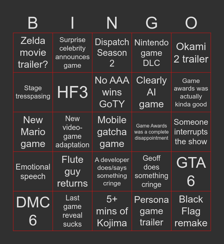 This bingo card has a free space and 34 words: New Xenoblade Reveal, Persona game trailer, Destiny 3?, Expedition 33 Wins all awards, Emotional speech, HF3, Okami 2 trailer, DMC 6, Surprise celebrity announces game, Valve appears, No AAA wins GoTY, Dispatch Season 2, New Fromsoft IP, Silk Song wins best indie, Game Awards was a complete disappointment, Game awards was actually kinda good, Last game reveal sucks, New Mario game, Flute guy returns, Geoff does something cringe, A developer does/says something cringe, Swearing, Zelda movie trailer?, Someone interrupts the show, 5+ mins of Kojima, Black Flag remake, Nintendo game DLC, Minecraft movie wins anything, Clearly AI game, Stage tresspasing, Silksong wins 0 awards, New video-game adaptation, GTA 6 and 67 mentioned.