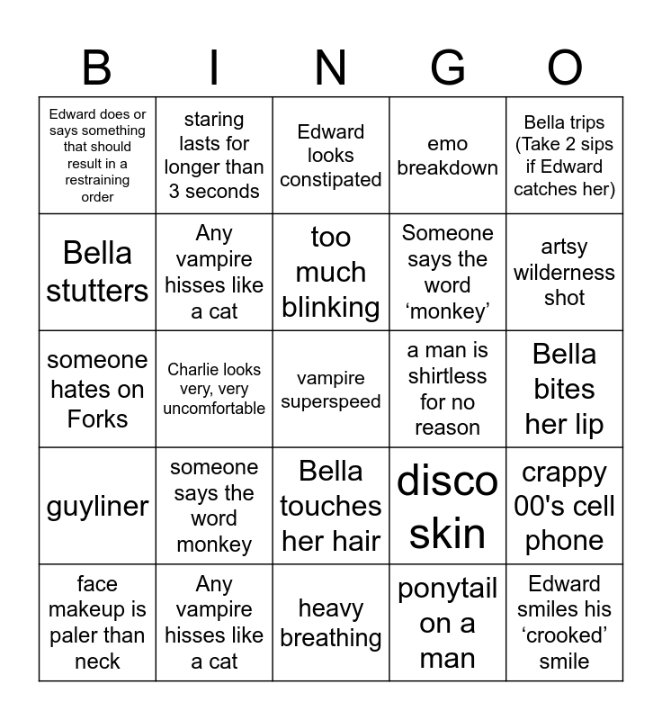 This bingo card has 25 words: someone says the word monkey, heavy breathing, too much blinking, face makeup is paler than neck, Bella trips (Take 2 sips if Edward catches her), Edward does or says something that should result in a restraining order, Bella stutters, staring lasts for longer than 3 seconds, a man is shirtless for no reason, Bella touches her hair, Someone says the word ‘monkey’, someone hates on Forks, disco skin, crappy 00's cell phone, Any vampire hisses like a cat, Edward smiles his ‘crooked’ smile, Bella bites her lip, Edward looks constipated, artsy wilderness shot, Charlie looks very, very uncomfortable, vampire superspeed, Any vampire hisses like a cat, guyliner, emo breakdown and ponytail on a man.