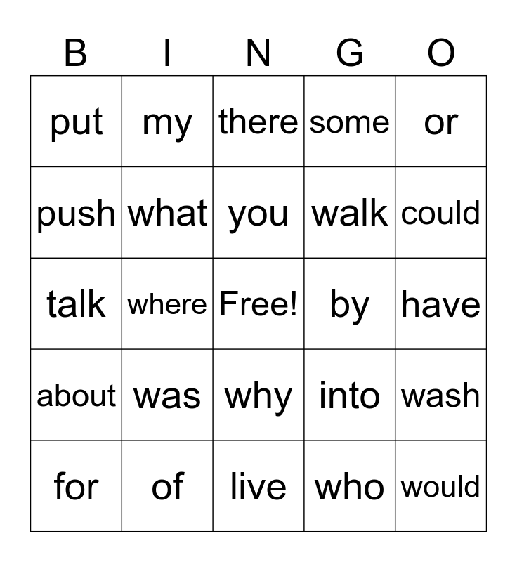 This bingo card has a free space and 24 words: was, of, you, for, or, put, push, my, by, why, walk, talk, into, wash, what, who, have, there, could, where, would, about, some and live.