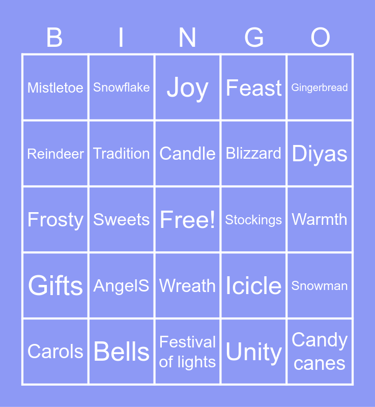 This bingo card has a free space and 24 words: AngelS, Bells, Candle, Carols, Gingerbread, Mistletoe, Reindeer, Snowflake, Stockings, Wreath, Blizzard, Frosty, Icicle, Snowman, Tradition, Unity, Warmth, Joy, Diyas, Sweets, Candy canes, Gifts, Feast and Festival of lights.