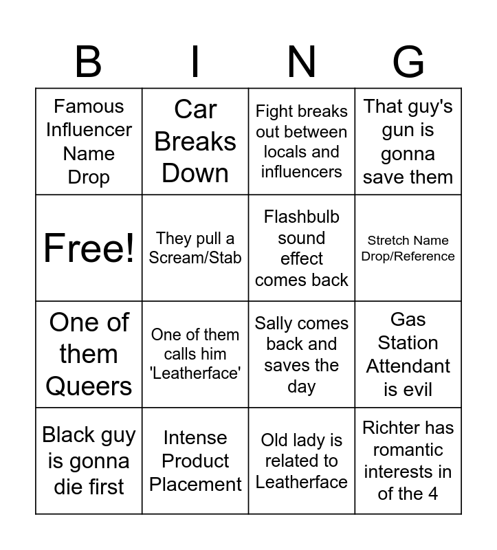 This bingo card has 16 words: Intense Product Placement, Gas Station Attendant is evil, Fight breaks out between locals and influencers, Famous Influencer Name Drop, One of them Queers, Car Breaks Down, Sally comes back and saves the day, Old lady is related to Leatherface, Free!, They pull a Scream/Stab, Black guy is gonna die first, That guy's gun is gonna save them, One of them calls him 'Leatherface', Stretch Name Drop/Reference, Flashbulb sound effect comes back and Richter has romantic interests in of the 4.