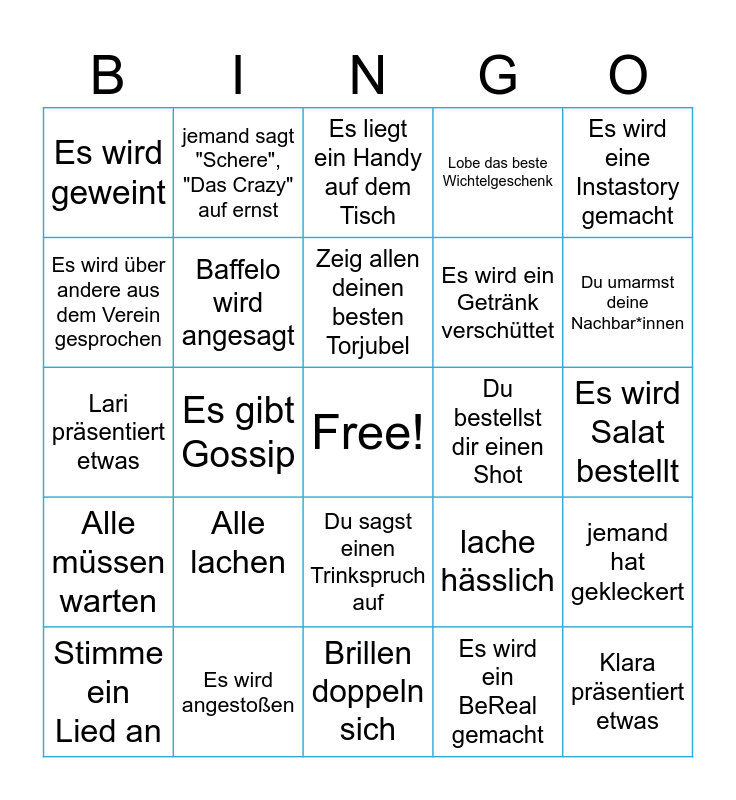 This bingo card has a free space and 29 words: Stimme ein Lied an, Jemand bestellt Sprudel, Es gibt Gossip, Es gibt streit um eine Sonnenbrille, Es wird geweint, Es liegt ein Handy auf dem Tisch, Baffelo wird angesagt, Alle lachen, Du bestellst dir einen Shot, Es wird angestoßen, Es wird Salat bestellt, Klara präsentiert etwas, Brillen doppeln sich, Es wird ein BeReal gemacht, Du umarmst deine Nachbar*innen, Jakob präsentiert etwas, Du sagst einen Trinkspruch auf, Alle müssen warten, Es wird eine Instastory gemacht, Lari präsentiert etwas, lache hässlich, gib der jüngsten eine Aufgabe, Es wird ein Getränk verschüttet, Es wird über andere aus dem Verein gesprochen, Lobe das beste Wichtelgeschenk, jemand sagt "Schere", "Das Crazy" auf ernst, jemand hat gekleckert, Zeig allen deinen besten Torjubel and Mach mindestens 3 Personen ein Kompliment.
