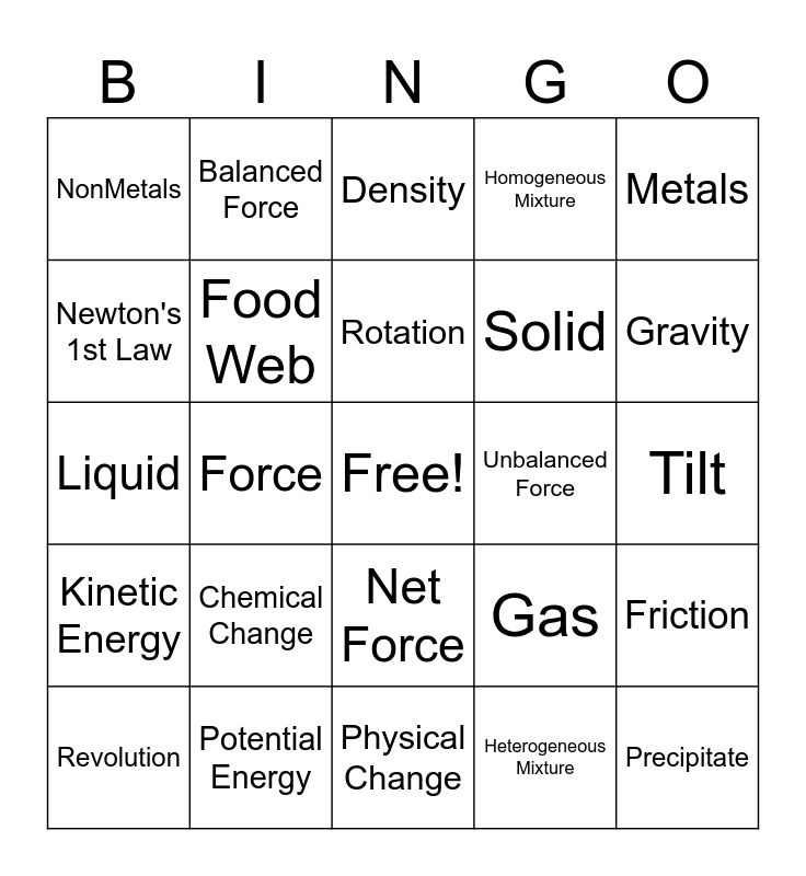 This bingo card has a free space and 25 words: Chemical Change, Physical Change, Rotation, Revolution, Metals, NonMetals, Newton's 1st Law, Balanced Force, Unbalanced Force, Net Force, Solid, Liquid, Gas, Friction, Food Web, Axis, Tilt, Density, Gravity, Force, Precipitate, Potential Energy, Kinetic Energy, Homogeneous Mixture and Heterogeneous Mixture.