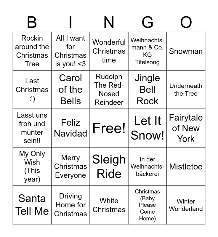 This bingo card has a free space and 24 words: Merry Christmas Everyone, Driving Home for Christmas, Rudolph The Red-Nosed Reindeer, Santa Tell Me, Snowman, Rockin around the Christmas Tree, Last Christmas :'), All I want for Christmas is you! <3, Let It Snow!, Sleigh Ride, Jingle Bell Rock, Lasst uns froh und munter sein!!, In der Weihnachts-bäckerei, Mistletoe, Carol of the Bells, Christmas (Baby Please Come Home), Fairytale of New York, Wonderful Christmas time, Underneath the Tree, Feliz Navidad, Winter Wonderland, My Only Wish (This year), Weihnachts- mann & Co. KG Titelsong and White Christmas.