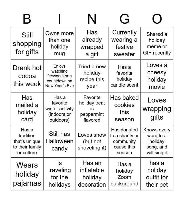 This bingo card has 36 words: Free!, Has a go-to holiday comfort food, Took a photo with a festive backdrop this season, Enjoys watching fireworks or a countdown on New Year’s Eve, Has donated to a charity or community cause this season, Has a tradition that’s unique to their family or culture, Tried a new holiday recipe this year, Has a favorite seasonal beverage (any kind!), Shared a holiday meme or GIF recently, Is looking forward to a fresh start in the new year, Has a favorite winter activity (indoors or outdoors), Currently wearing a festive sweater, Prefers egg nog over hot cocoa, Has baked cookies this season, Loves a cheesy holiday movie, Still shopping for gifts, has a holiday outfit for their pet, Still has Halloween candy, Favorite holiday treat is peppermint flavored, Has already wrapped a gift, Loves wrapping gifts, Knows every word to a holiday song, and will sing it, Is traveling for the holidays, Wears holiday pajamas, Has an inflatable holiday decoration, Owns more than one holiday mug, Has mailed a holiday card, Displays a meaningful holiday keepsake year after year, Has a favorite holiday candle scent, Drank hot cocoa this week, Has watched a holiday movie already, WFH desk has holiday décor, Has a holiday Zoom background, Loves snow (but not shoveling it), Has personalized stockings and Has a New Year Resolution.