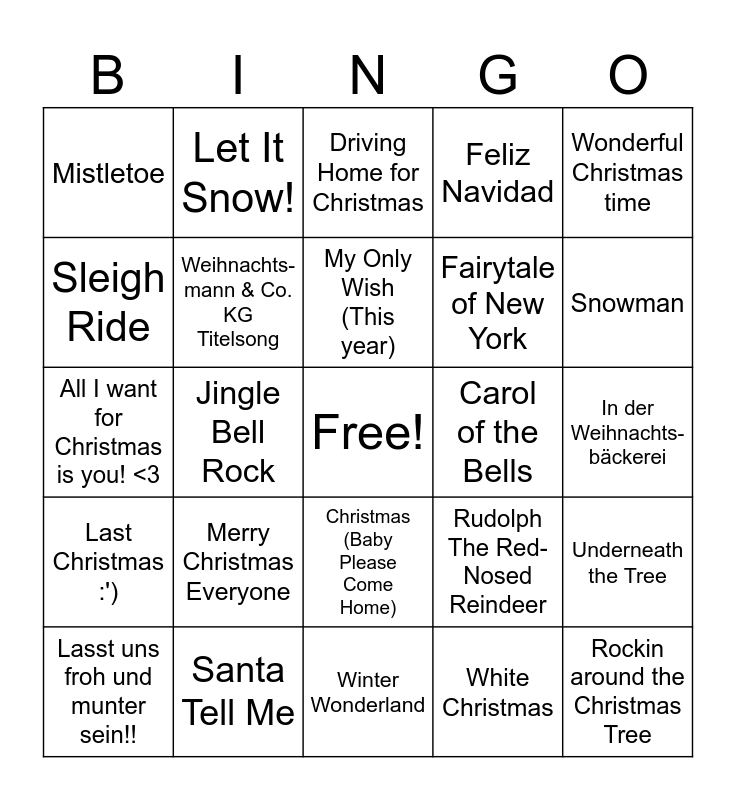 This bingo card has a free space and 24 words: Merry Christmas Everyone, Santa Tell Me, My Only Wish (This year), Lasst uns froh und munter sein!!, Wonderful Christmas time, Mistletoe, Sleigh Ride, Let It Snow!, Carol of the Bells, Christmas (Baby Please Come Home), Fairytale of New York, All I want for Christmas is you! <3, Rudolph The Red-Nosed Reindeer, Underneath the Tree, Weihnachts- mann & Co. KG Titelsong, White Christmas, In der Weihnachts-bäckerei, Driving Home for Christmas, Snowman, Jingle Bell Rock, Rockin around the Christmas Tree, Last Christmas :'), Feliz Navidad and Winter Wonderland.