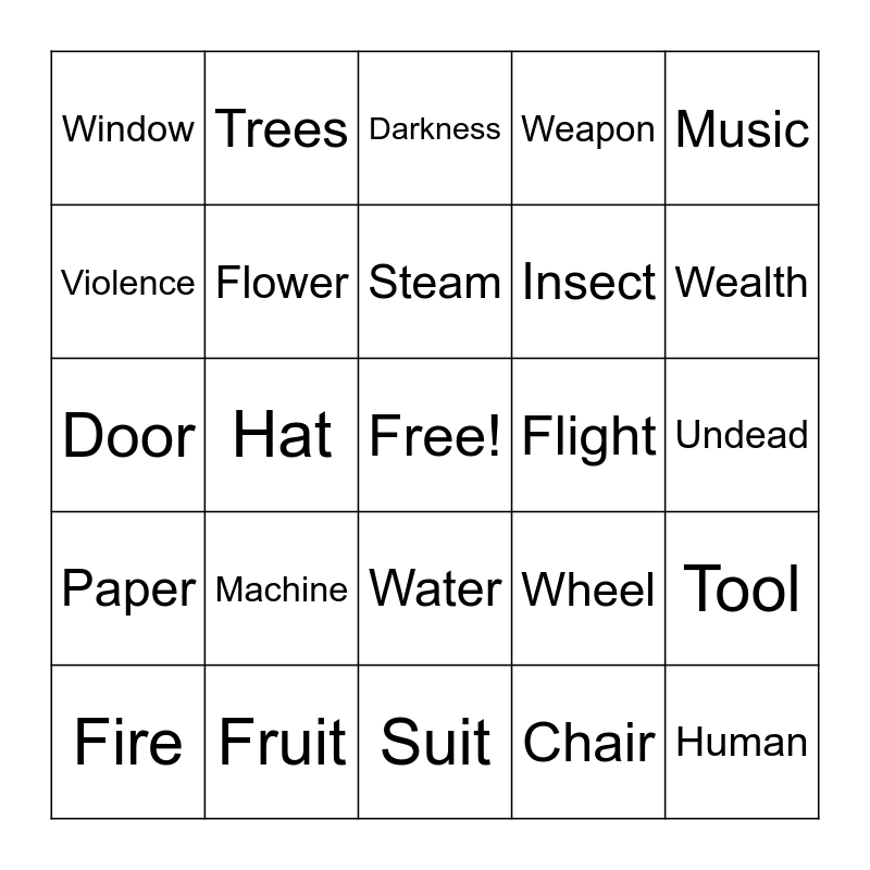 This bingo card has a free space and 28 words: Tool, Rodent, Insect, Chair, Violence, Darkness, Trees, Paper, Flight, Fire, Door, Weapon, Fruit, Suit, Wealth, Vehicle, Machine, Flower, Steam, Water, Window, Tower, Human, Hat, Undead, Wheel, Music and Imprisonment.