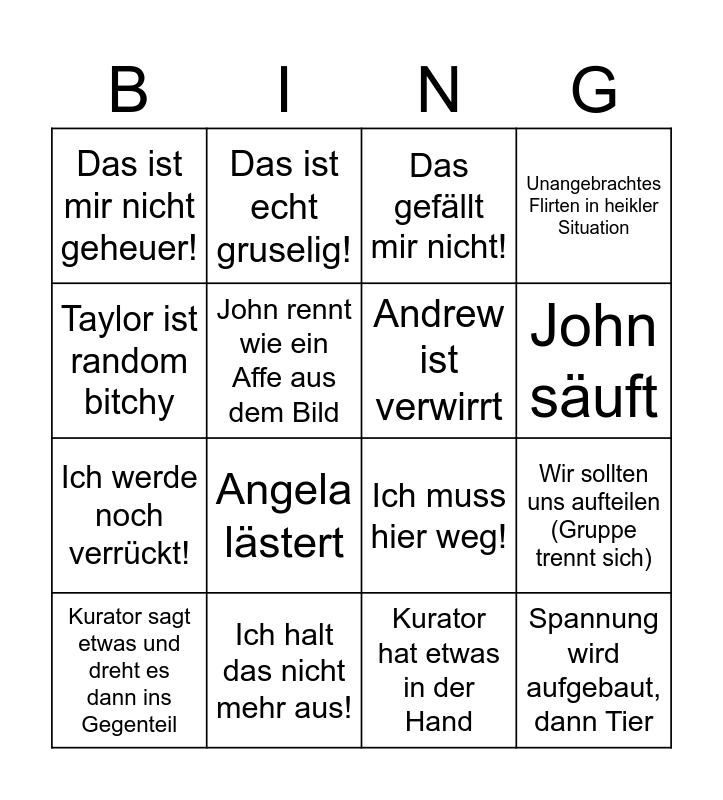 This bingo card has 16 words: Ich halt das nicht mehr aus!, Wir sollten uns aufteilen (Gruppe trennt sich), Das gefällt mir nicht!, Das ist mir nicht geheuer!, Ich werde noch verrückt!, Das ist echt gruselig!, Ich muss hier weg!, Kurator hat etwas in der Hand, Taylor ist random bitchy, John rennt wie ein Affe aus dem Bild, Kurator sagt etwas und dreht es dann ins Gegenteil, Unangebrachtes Flirten in heikler Situation, Angela lästert, John säuft, Andrew ist verwirrt and Spannung wird aufgebaut, dann Tier.
