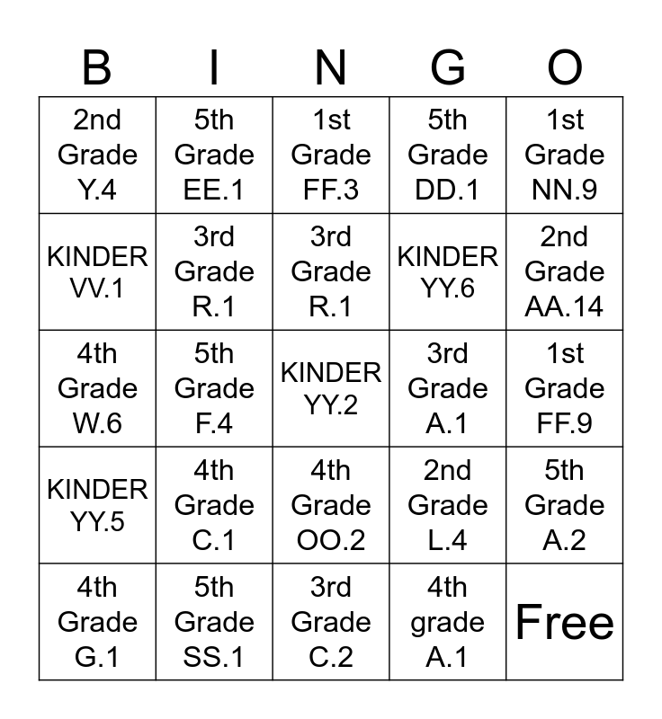 This bingo card has a free space and 35 words: KINDER TT.2, 1st Grade AA.4, 2nd Grade AA.8, 3rd Grade R.1, 4th Grade OO.2, 5th Grade DD.1, KINDER VV.1, 1st Grade FF.7, 3rd Grade R.1, 3rd Grade C.1, 4th Grade W.6, 1st Grade NN.9, KINDER WW.11, 1st Grade AA.2, 2nd Grade Y.4, 3rd Grade A.1, 4th grade A.1, 5th Grade F.4, KINDER YY.5, Free, 2nd Grade L.4, 4th Grade G.1, 5th Grade A.2, 5th Grade SS.1, 1st Grade FF.3, 2nd Grade AA.14, 3rd Grade A.5, 4th Grade U.4, KINDER YY.6, 1st Grade FF.9, 2nd Grade LL.5, 3rd Grade C.2, 4th Grade C.1, 5th Grade EE.1 and 5th Grade W.9.