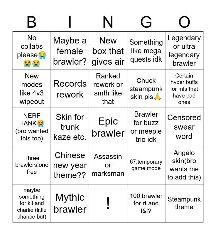 This bingo card has 25 words: Three brawlers,one free, Mythic brawler, Epic brawler, 100.brawler for rt and l&l?, Legendary or ultra legendary brawler, No collabs please😭😭😭, Maybe a female brawler?, New box that gives air, Brawler for buzz or meeple trio idk, Angelo skin(bro wants me to add this), New modes like 4v3 wipeout, Records rework, !, 67.temporary game mode, Certain hyper buffs for mfs that have bad ones, maybe something for kit and charlie (little chance but), Skin for trunk kaze etc., Ranked rework or smth like that, Chuck steampunk skin pls🙏, Censored swear word, NERF HANK😭(bro wanted this too), Chinese new year theme??, Assassin or marksman, Something like mega quests idk and Steampunk theme.