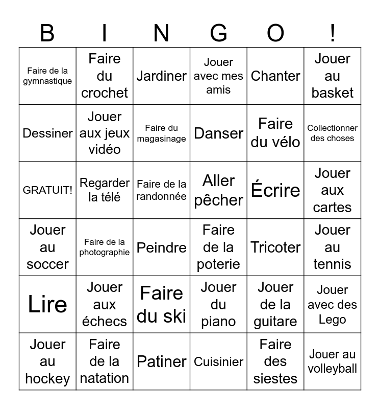 This bingo card has 36 words: Jouer du piano, Faire du ski, Cuisinier, Dessiner, Jouer au soccer, Aller pêcher, Jouer aux jeux vidéo, Patiner, Chanter, Jouer de la guitare, Collectionner des choses, Jouer avec mes amis, Jouer avec des Lego, Regarder la télé, Danser, Faire de la gymnastique, Lire, Écrire, GRATUIT!, Jardiner, Faire de la randonnée, Faire de la photographie, Faire de la poterie, Peindre, Tricoter, Faire du crochet, Faire du vélo, Faire de la natation, Faire du magasinage, Jouer au basket, Jouer au volleyball, Jouer au hockey, Jouer au tennis, Jouer aux cartes, Jouer aux échecs and Faire des siestes.