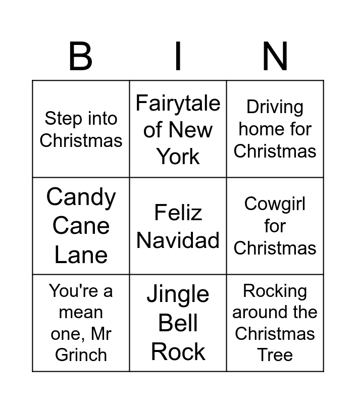 This bingo card has 25 words: Last Christmas, Santa Baby, Jingle Bell Rock, Winter Wonderland, Feliz Navidad, Step into Christmas, Cowgirl for Christmas, Fairytale of New York, Merry Christmas Everyone, I saw Mummy kissing Santa Claus, Rocking around the Christmas Tree, Santa Tell me, Underneath the tree, I wish it could be Christmas every day, You're a mean one, Mr Grinch, Kidnap the Sandy Claws, Holly Jolly Christmas, Driving home for Christmas, You're Christmas to me, Deck the Halls, You make it feel like Christmas, Stay another day, Christmas saves the year, Candy Cane Lane and Think of Christmas.