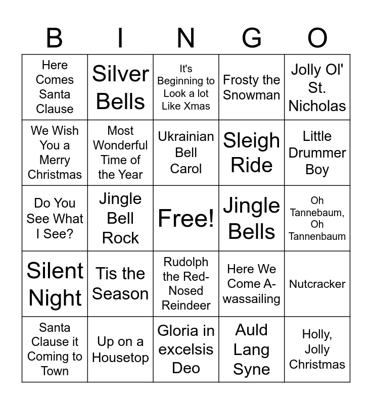 This bingo card has a free space and 24 words: Tis the Season, Up on a Housetop, Ukrainian Bell Carol, Santa Clause it Coming to Town, Jolly Ol' St. Nicholas, Here Comes Santa Clause, We Wish You a Merry Christmas, Silver Bells, Jingle Bells, Rudolph the Red-Nosed Reindeer, Sleigh Ride, Do You See What I See?, Here We Come A-wassailing, Nutcracker, Most Wonderful Time of the Year, Auld Lang Syne, Oh Tannebaum, Oh Tannenbaum, It's Beginning to Look a lot Like Xmas, Little Drummer Boy, Jingle Bell Rock, Holly, Jolly Christmas, Silent Night, Frosty the Snowman and Gloria in excelsis Deo.