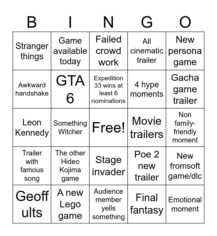 This bingo card has a free space and 24 words: The other Hideo Kojima game, A new Lego game, Expedition 33 wins at least 6 nominations, Geoff ults, New persona game, Stranger things, Awkward handshake, Game available today, Movie trailers, Stage invader, 4 hype moments, Leon Kennedy, Poe 2 new trailer, New fromsoft game/dlc, GTA 6, Final fantasy, Non family-friendly moment, Failed crowd work, Gacha game trailer, Something Witcher, Emotional moment, Trailer with famous song, All cinematic trailer and Audience member yells something.