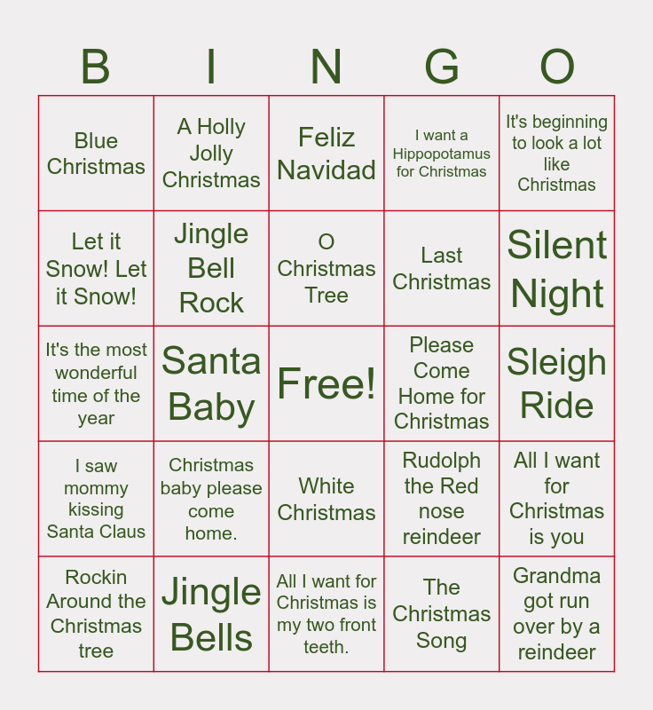 This bingo card has a free space and 24 words: Christmas baby please come home., Jingle Bells, O Christmas Tree, Rockin Around the Christmas tree, It's beginning to look a lot like Christmas, Blue Christmas, Let it Snow! Let it Snow!, A Holly Jolly Christmas, Please Come Home for Christmas, White Christmas, Last Christmas, It's the most wonderful time of the year, Rudolph the Red nose reindeer, All I want for Christmas is you, Jingle Bell Rock, The Christmas Song, Sleigh Ride, Feliz Navidad, Silent Night, Santa Baby, Grandma got run over by a reindeer, I saw mommy kissing Santa Claus, I want a Hippopotamus for Christmas and All I want for Christmas is my two front teeth..