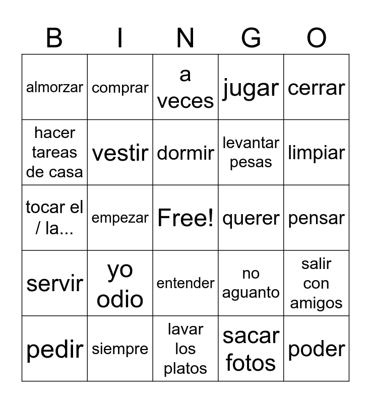 This bingo card has a free space and 39 words: preferir, contar, medir, vestir, pedir, entender, dormir, competir, cerrar, servir, empezar, jugar, poder, pensar, querer, yo odio, morir, almorzar, sacar un libro, no aguanto, hacer tareas de casa, lavar los platos, levantar pesas, limpiar, textear, cocinar, caminar, ir de compras, con, comprar, esquiar, a menudo, a veces, siempre, sacar fotos, en mi tiempo libre, salir con amigos, tocar el / la... and lavar la ropa.