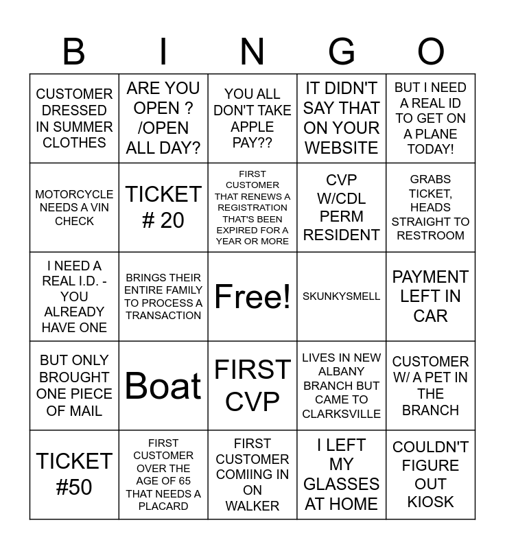 This bingo card has a free space and 24 words: Boat, FIRST CUSTOMER OVER THE AGE OF 65 THAT NEEDS A PLACARD, FIRST CUSTOMER THAT RENEWS A REGISTRATION THAT'S BEEN EXPIRED FOR A YEAR OR MORE, TICKET #50, BUT I NEED A REAL ID TO GET ON A PLANE TODAY!, CUSTOMER DRESSED IN SUMMER CLOTHES, MOTORCYCLE NEEDS A VIN CHECK, ARE YOU OPEN ? /OPEN ALL DAY?, SKUNKYSMELL, FIRST CVP, CVP W/CDL PERM RESIDENT, I NEED A REAL I.D. -YOU ALREADY HAVE ONE, LIVES IN NEW ALBANY BRANCH BUT CAME TO CLARKSVILLE, CUSTOMER W/ A PET IN THE BRANCH, TICKET # 20, I LEFT MY GLASSES AT HOME, PAYMENT LEFT IN CAR, YOU ALL DON'T TAKE APPLE PAY??, GRABS TICKET, HEADS STRAIGHT TO RESTROOM, BRINGS THEIR ENTIRE FAMILY TO PROCESS A TRANSACTION, COULDN'T FIGURE OUT KIOSK, BUT ONLY BROUGHT ONE PIECE OF MAIL, IT DIDN'T SAY THAT ON YOUR WEBSITE and FIRST CUSTOMER COMIING IN ON WALKER.