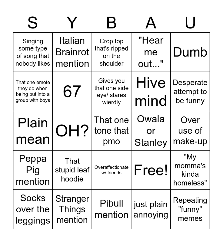 This bingo card has 25 words: That stupid leaf hoodie, Pibull mention, Gives you that one side eye/ stares wierdly, Socks over the leggings, Dumb, Singing some type of song that nobody likes, That one emote they do when being put into a group with boys, Italian Brainrot mention, Owala or Stanley, Overaffectionate w/ friends, Hive mind, Plain mean, Free!, "My momma's kinda homeless", 67, Repeating "funny" memes, Over use of make-up, Crop top that's ripped on the shoulder, Desperate attempt to be funny, OH?, That one tone that pmo, Stranger Things mention, Peppa Pig mention, "Hear me out..." and just plain annoying.