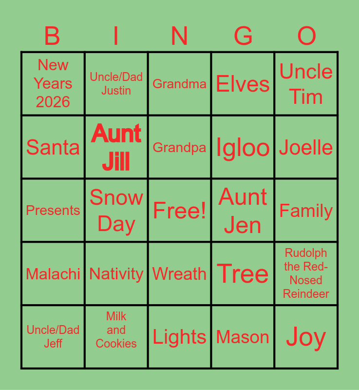 This bingo card has a free space and 34 words: Christmas, Mason, Mariah, Jayla, Malachi, Aunt Jill, Uncle Tim, Uncle/Dad Jeff, Uncle/Dad Justin, Aunt/Mom Merideth, Grandpa, Grandma, Rylie, Shane, Aunt Jen, Joelle, Milk and Cookies, Presents, Nativity, Tree, Wreath, No school, New Years 2026, Family, Lights, Joy, Elves, Sledding, Igloo, Santa, Hot Chocolate, Snow Day, Rudolph the Red-Nosed Reindeer and Frosty.
