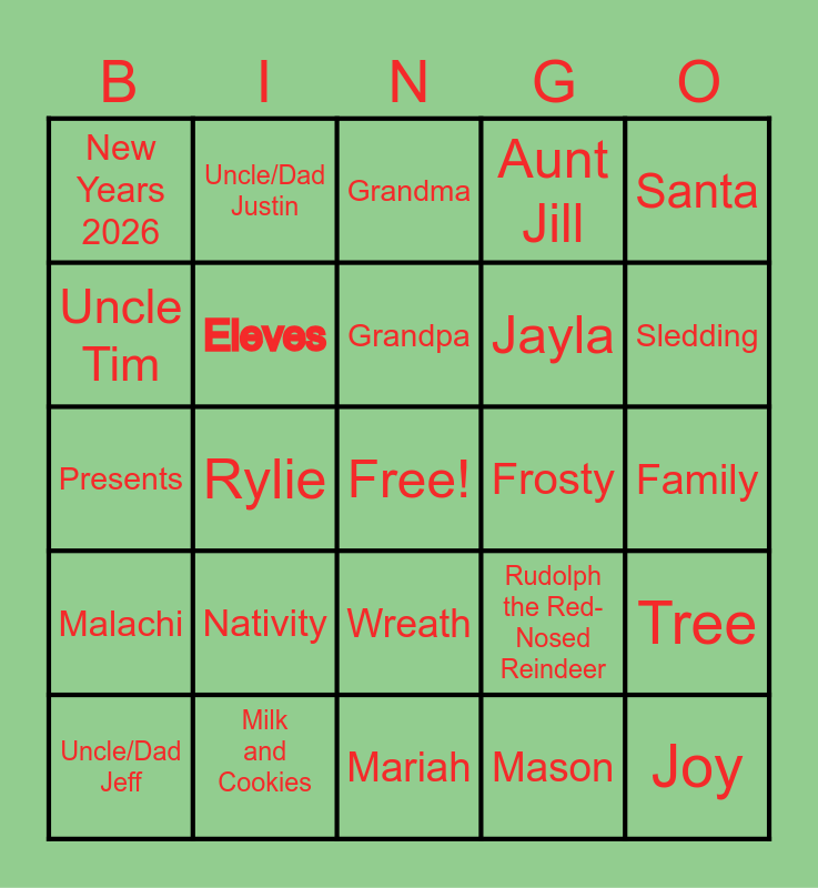 This bingo card has a free space and 34 words: Christmas, Mason, Lights, Igloo, Malachi, Eleves, Santa, Uncle/Dad Jeff, Uncle/Dad Justin, Aunt/Mom Merideth, Grandpa, Grandma, Snow Day, Hot Chocolate, Frosty, Sledding, Milk and Cookies, Presents, Nativity, Rudolph the Red-Nosed Reindeer, Wreath, No school, New Years 2026, Family, Mariah, Joy, Aunt Jill, Joelle, Jayla, Uncle Tim, Shane, Rylie, Tree and Aunt Jen.