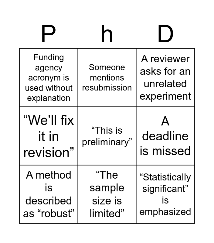 This bingo card has 60 words: “Reviewer 2” is mentioned, “We need more data”, “This should be straightforward”, A figure was remade at the last minute, Coffee is treated as a research tool, “It worked once”, A method is described as “robust”, Someone mentions impact factor, “Statistically significant” is emphasized, A negative result is called “interesting”, “We’ll fix it in revision”, A deadline is extended, A deadline is missed, Someone apologizes for too many slides, “Due to time constraints…”, Funding agency acronym is used without explanation, A collaboration is called “very productive”, “This is preliminary”, A control experiment is added late, “The sample size is limited”, Someone mentions lack of funding, A reviewer asks for an unrelated experiment, “The data speak for themselves”, An experiment is described as “tricky”, Someone says “In theory…”, A protocol is followed “with minor modifications”, “This is outside the scope of the study”, A meeting could have been an email, Someone mentions working on the weekend, A figure legend is longer than the text, A method section references another paper for details, Someone says “It’s well known that…”, A hypothesis is refined after seeing the results, A grant is described as “competitive”, Someone mentions resubmission, “We almost gave up on this”, A result is called “unexpected”, A PI says “Interesting…”, A PhD student explains a senior author’s work, A statistical test is chosen post hoc, Someone mentions sample storage issues, “We don’t fully understand the mechanism”, A figure is described as “self-explanatory”, Someone mentions bioinformatics troubleshooting, “Let’s discuss this offline”, A lab meeting runs over time, Someone mentions ethics approval delays, “This will strengthen the paper”, A dataset is described as “messy”, Someone references Supplementary Figure 12, “We had to optimize this extensively”, A reviewer requests more references, Someone mentions batch effects, “This opens many new questions”, A study is described as “proof of concept”, A method only one person in the lab understands, “We are underpowered”, A timeline is described as “ambitious”, Someone mentions a rejected manuscript and “The results are reproducible… mostly”.