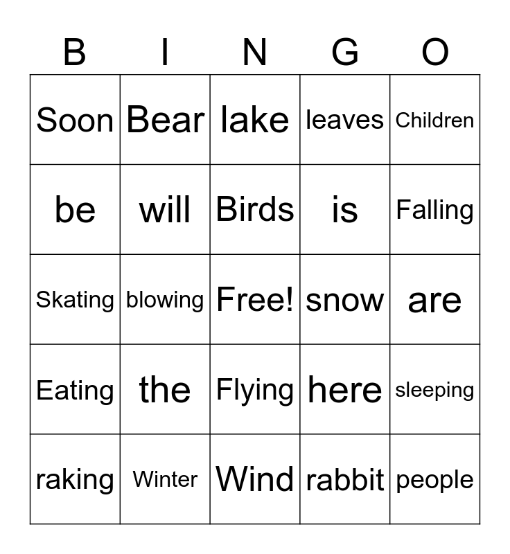 This bingo card has a free space and 24 words: the, Winter, Birds, raking, Children, Soon, be, Bear, snow, Flying, is, Skating, here, sleeping, will, rabbit, are, lake, Falling, blowing, people, Eating, leaves and Wind.