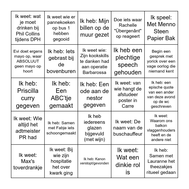 This bingo card has a free space and 24 words: Ik heb: Samen met Fabje iets schoongemaakt, Ik weet: Bij wie zijn hospitatie het over kwark ging, Ik weet wie: Zijn kookskills te danken had aan operatie Barbarossa, Ik weet: Max's toverdrankje, Ik speel: Met Menno Steen Papier Bak, Ik weet: wat je moet drinken bij Phil Collins tijdens DPH, Evi doet ergens mayo op, waar ABSOLUUT geen mayo op hoort, Ik weet wie er pannekoeken op bus 1 hebben gegooid, Ik weet: van wie hangt de afstudeer poster in Carre, Ik heb iedereens glazen bijgevuld (met wijn), Ik heb een plechtige speech gehouden, Ik heb: Priscilla curry gegeven, Ik weet: De naam van de buschauffeur, Ik weet: Waarom ons balkon vlaggenhouders heeft en de andere niet, Ik heb: Iets gebrast bij de bovenburen, Ik weet: Wat een dinkie rol is, Ik heb: een epische quote van een ander van deze avond op de wc geschreven, Ik heb: Mijn billen op de muur gezet, Begin een gesprek met yorick over een vage oorlog die niemand kent, Ik heb: Een ABC’tje gemaakt, Ik heb: Samen met Lauranne het theezakjes ritueel gedaan, Ik weet: Wie altijd het adtmeister PR had, Doe iets waar Rachelle "Übergenânt" op reageert and Ik heb: Kanon verstopt/gevonden.