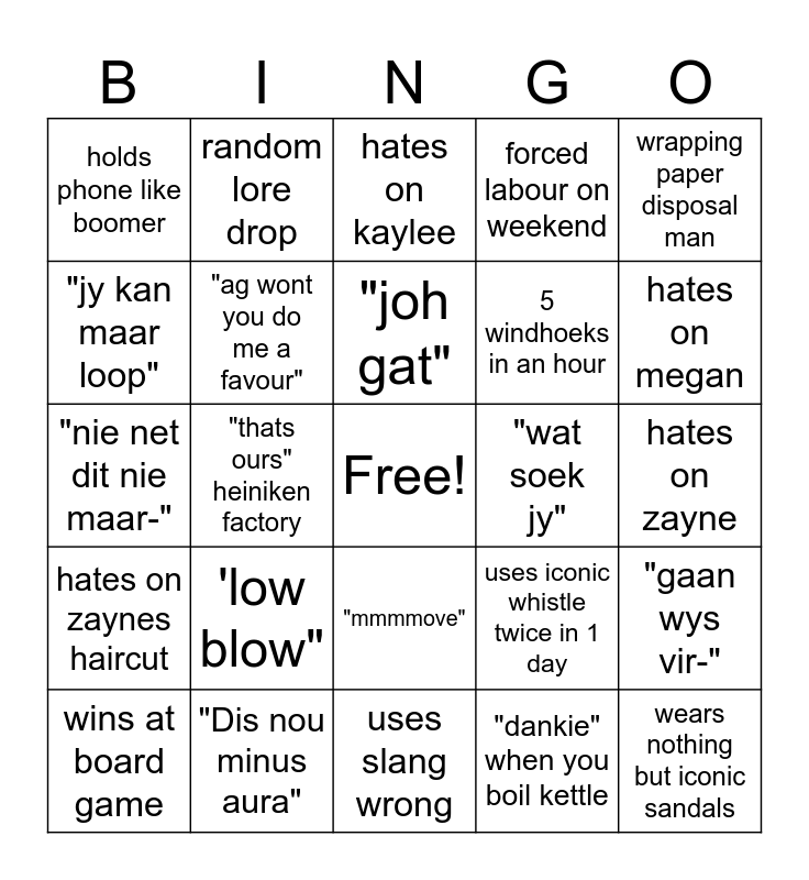 This bingo card has a free space and 24 words: 'low blow", "Dis nou minus aura", "joh gat", wins at board game, wrapping paper disposal man, holds phone like boomer, "jy kan maar loop", random lore drop, "wat soek jy", "mmmmove", 5 windhoeks in an hour, "nie net dit nie maar-", uses iconic whistle twice in 1 day, "gaan wys vir-", "ag wont you do me a favour", "dankie" when you boil kettle, hates on zayne, hates on kaylee, hates on megan, "thats ours" heiniken factory, wears nothing but iconic sandals, hates on zaynes haircut, forced labour on weekend and uses slang wrong.