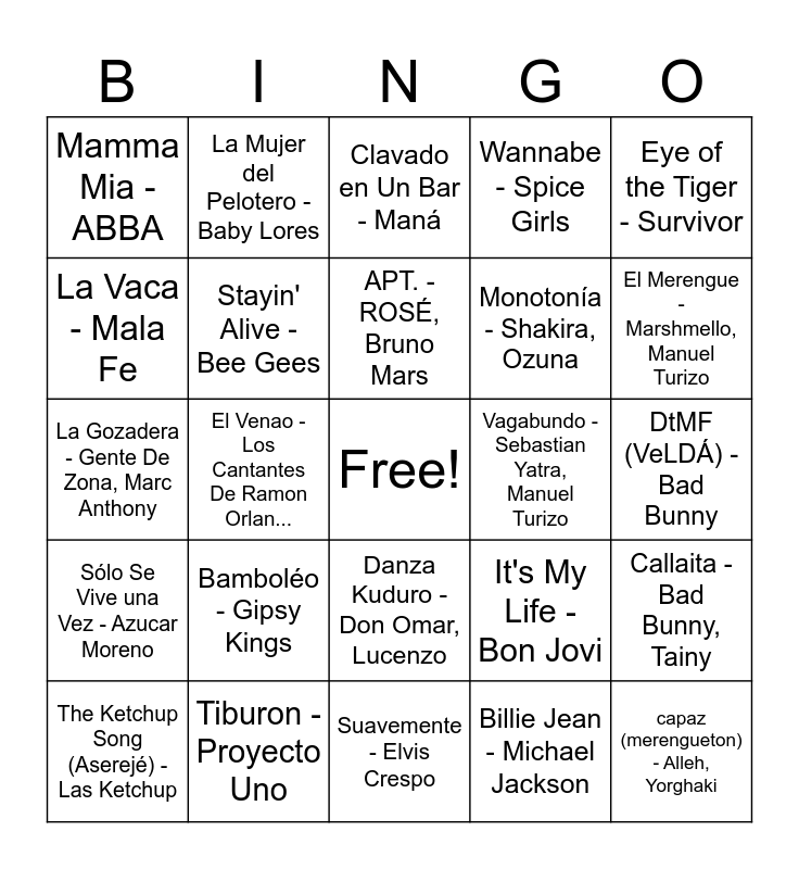This bingo card has a free space and 42 words: Antes Muerta Que Sencilla - María Isabel, APT. - ROSÉ, Bruno Mars, Atrévete-Te-Te - Calle 13, Bamboléo - Gipsy Kings, Billie Jean - Michael Jackson, Callaita - Bad Bunny, Tainy, capaz (merengueton) - Alleh, Yorghaki, Ciega, Sordomuda - Shakira, Clavado en Un Bar - Maná, Danza Kuduro - Don Omar, Lucenzo, DtMF (VeLDÁ) - Bad Bunny, El Merengue - Marshmello, Manuel Turizo, El Venao - Los Cantantes De Ramon Orlan..., Eye of the Tiger - Survivor, I Want To Break Free - Queen, It's My Life - Bon Jovi, La Bomba - King Africa, La Gozadera - Gente De Zona, Marc Anthony, La Incondicional - Luis Miguel, La Mujer del Pelotero - Baby Lores, La Vaca - Mala Fe, La Vida Es Un Carnaval - Celia Cruz, Macarena - Los Del Rio, Mamma Mia - ABBA, Mayonesa - Chocolate, Mi gran noche - Raphael, Monotonía - Shakira, Ozuna, Navidad Sin Ti - Los Bukis, Por Debajo De La Mesa - Luis Miguel, Quince años tiene mi amor - Duo Dinamico, Si Antes Te Hubiera Conocido - KAROL G, Sólo Se Vive una Vez - Azucar Moreno, Stayin' Alive - Bee Gees, Suavemente - Elvis Crespo, Sweet Child O' Mine - Guns N' Roses, The Ketchup Song (Aserejé) - Las Ketchup, Tiburon - Proyecto Uno, Vagabundo - Sebastian Yatra, Manuel Turizo, Vivir Mi Vida - Marc Anthony, Vuela, Vuela (Voyage, Voyage) - Magneto, Wannabe - Spice Girls and Casi un hechizo- Jerry Rivera.