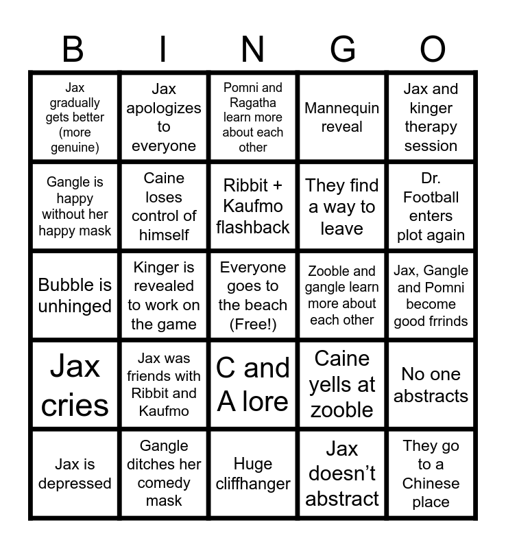 This bingo card has a free space and 24 words: Jax is depressed, Jax was friends with Ribbit and Kaufmo, Ribbit + Kaufmo flashback, Jax doesn’t abstract, Jax and kinger therapy session, Jax gradually gets better (more genuine), Jax apologizes to everyone, Pomni and Ragatha learn more about each other, Zooble and gangle learn more about each other, Jax, Gangle and Pomni become good frrinds, Bubble is unhinged, Caine loses control of himself, Caine yells at zooble, No one abstracts, Gangle is happy without her happy mask, Gangle ditches her comedy mask, Huge cliffhanger, Mannequin reveal, Dr. Football enters plot again, Jax cries, Kinger is revealed to work on the game, C and A lore, They find a way to leave and They go to a Chinese place.