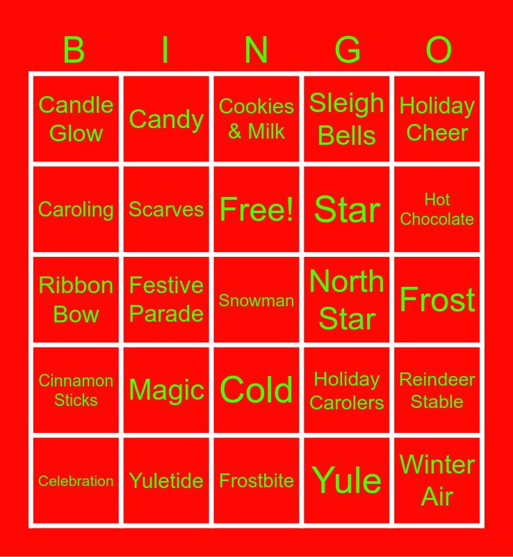 This bingo card has 151 words: Snow, Santa, Reindeer, Sleigh, Elves, Frosty, Mistletoe, Holly, Jolly, Presents, Stockings, Chimney, Free!, Cookies, Hot Chocolate, Caroling, Gingerbread, North Pole, Blizzard, Fireplace, Ornaments, Snowflake, Wreath, Candy Cane, Rudolph, Festive, Winter, Snowman, Icicles, Noel, Nutcracker, Tinsel, Garland, Yule, Peace, Joy, Eggnog, Bells, Sleigh Bells, Snowfall, Evergreen, Saint Nick, Cookies & Milk, Wrapping Paper, Christmas Tree, Lights, Nativity, Silent Night, Star, Wise Men, Holiday Spirit, Candy, Frostbite, Fireplace Mantle, Warmth, Peppermint, Polar Express, Poinsettia, Rejoice, Glitter, Winter Wonderland, Snowstorm, Cold, Sledding, Snow Boots, Mittens, Scarves, Family, Gathering, Tradition, Celebration, Magic, Cookies Exchange, Festivities, Starry Night, Gift Tags, Holiday Music, Santa’s List, North Star, Frost, Warm Wishes, Peace on Earth, Sleigh Ride, Hearth, Holiday Cheer, Angel, Yuletide, Stocking Stuffer, Christmas Eve, Christmas Morning, Candy Shop, Ice Skates, Cocoa, Snowdrift, Winter Air, Snowflakes, Gift Wrap, Carol, Frozen, Santa’s Workshop, Merry Christmas, Sugarplum, North Wind, Sleigh Tracks, Winter Lights, Gingerbread House, Snow Angel, Holiday Parade, Santa’s Workshop Elves, Warm Mitts, Fireplace Cocoa, Holiday Lantern, Frosted Windows, Winter Mitts, Holiday Postcard, Ribbon Bow, Frosted Pines, Christmas Countdown, Yuletide Feast, Reindeer Stable, Candle Glow, Snow Cabin, Evergreen Forest, Hot Apple Cider, Cozy Toque, Holiday Market Stall, Festive Parade, Snow Tracks, Santa’s Route, Wish List Letter, Holiday Cookies Tin, Warm Fireplace Rug, Winter Mittens, Holiday Carolers, Toboggan, Cinnamon Sticks, Frosted Branches, Winter Cabin, Candy Cottage, Holiday Train Ride, Christmas Ornament Box, Winter Cranberries, Holiday Tradition Dinner, Snowshoe Trail, Winter Moon, Pinecones, Christmas Star Lantern, Holiday Sweater Day, Festive Scents, Garland Bow and Sugar Cookie House.