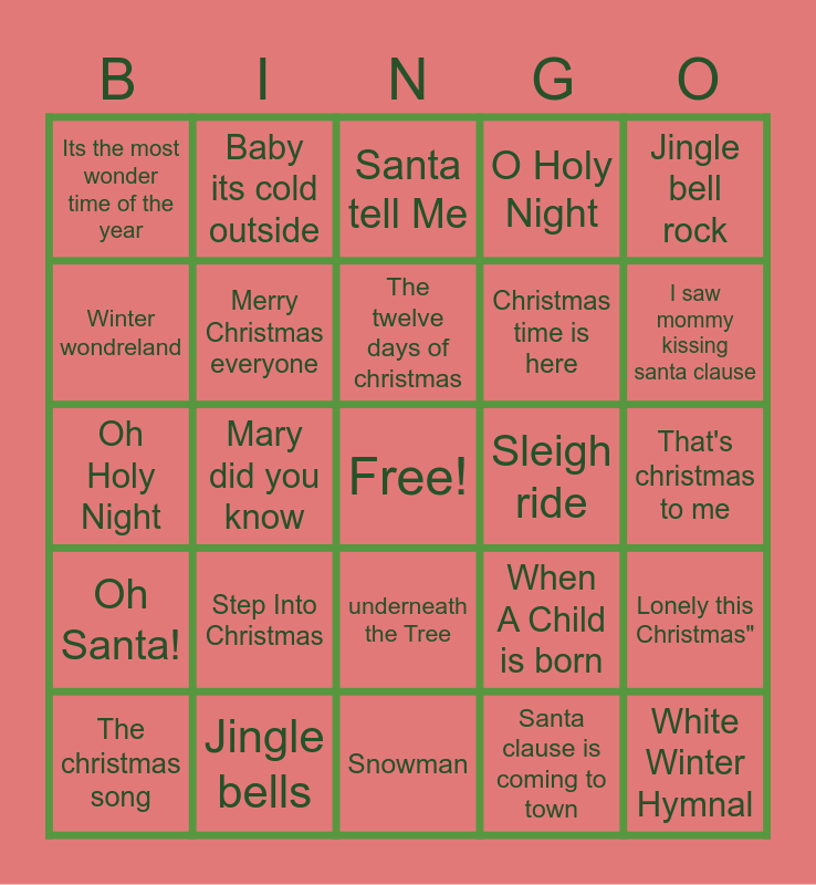 This bingo card has a free space and 37 words: Santa baby, Rudolph the red nosed reindeer, All I want for christmas is you, Merry Christmas everyone, Lonely this Christmas", Step Into Christmas, The twelve days of christmas, Rockin' round the christmas tree, Jingle bell rock, We wish you a merry Christmas, Mary did you know, O Holy Night, White Winter Hymnal, That's christmas to me, Winter wondreland, Oh Santa!, OCome, All ye faithful, Santa tell Me, underneath the Tree, Sleigh ride, Its the most wonder time of the year, I saw mommy kissing santa clause, The christmas song, Snowman, Have yourself a merry little christmas, Santa clause is coming to town, Baby its cold outside, Grandma got ran over by a reindeer, Here comes Santa Clause, Blue Christmas, The First Noel, Jingle bells, Oh Holy Night, All alone on christmas, When A Child is born, Christmas time is here and What Christmas means to me.