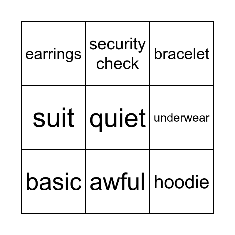 This bingo card has 21 words: arrivals, departures, security check, generous, lazy, basic, earrings, bracelet, necklace, awful, hoodie, suit, cardigan, kind, underwear, moustache, beard, belt, quiet, talkative and warm.