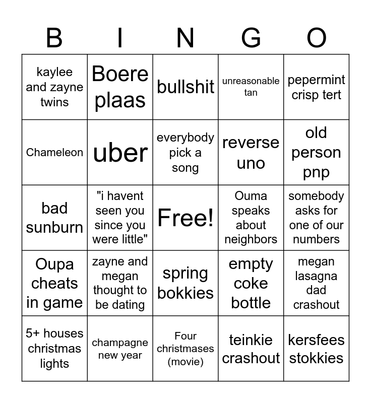 This bingo card has a free space and 27 words: empty coke bottle, the grinch (movie), reverse uno, Four christmases (movie), Chameleon, bullshit, Boere plaas, Oupa cheats in game, Ouma speaks about neighbors, megan lasagna dad crashout, bad sunburn, unreasonable tan, 5+ houses christmas lights, champagne new year, old person pnp, checkers 60 60, uber, everybody pick a song, zayne and megan thought to be dating, kaylee and zayne twins, somebody asks for one of our numbers, teinkie crashout, "i havent seen you since you were little", kersfees stokkies, spring bokkies, pepermint crisp tert and megan talks to tienkie like a human.