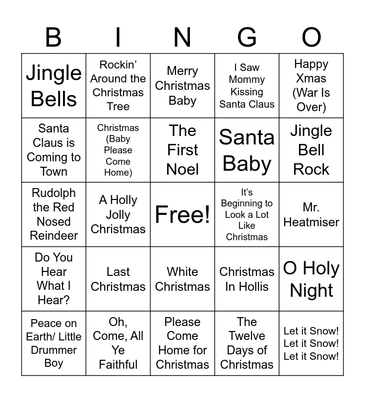 This bingo card has a free space and 36 words: All I Want for Christmas Is You, Baby It’s Old Outside, Blue Christmas, Christmas (Baby Please Come Home), Christmas In Hollis, Do You Hear What I Hear?, The First Noel, Frosty The Snowman, Happy Xmas (War Is Over), Have Yourself A Merry Little Christmas, A Holly Jolly Christmas, I Saw Mommy Kissing Santa Claus, I’ll Be Home ForChristmas, It’s Beginning to Look a Lot Like Christmas, Jingle Bell Rock, Jingle Bells, Joy to the World, Last Christmas, Let it Snow! Let it Snow! Let it Snow!, Merry Christmas Baby, Mr. Heatmiser, O Holy Night, Oh, Come, All Ye Faithful, Peace on Earth/ Little Drummer Boy, Please Come Home for Christmas, Rockin’ Around the Christmas Tree, Rudolph the Red Nosed Reindeer, Run Rudolph Run, Santa Baby, Santa Claus is Coming to Town, Silent Night, Sleigh Ride, The Twelve Days of Christmas, White Christmas, Winter Wonderland and You’re a Mean One Mr. Grinch.
